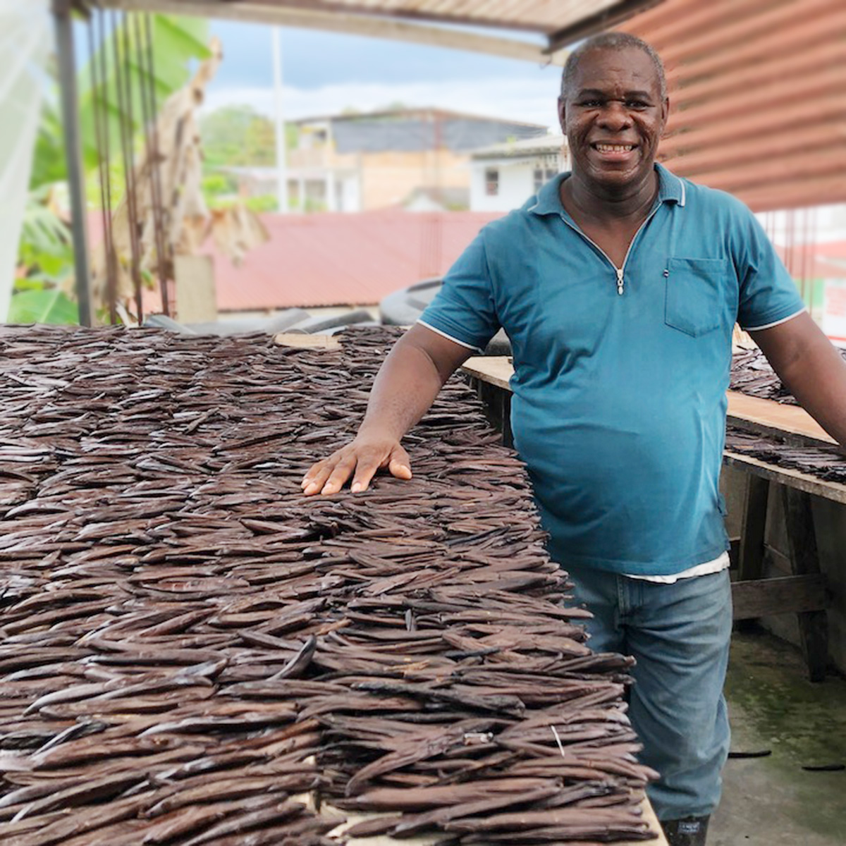コロンビア南西部、トゥマコのカカオ生産者グスターボさんは、幼少の頃、お父さんのカカオ農園で遊ぶことがありました。そこで見かけた細長く甘い香りの植物。当時のグスターボさんはそれが何であるかは知りませんでした。2014年フランス・パリ、大人になって訪れたチョコレートの祭典のマダガスカルブースで、その植物がバニラであったことを生まれて初めて知りました。