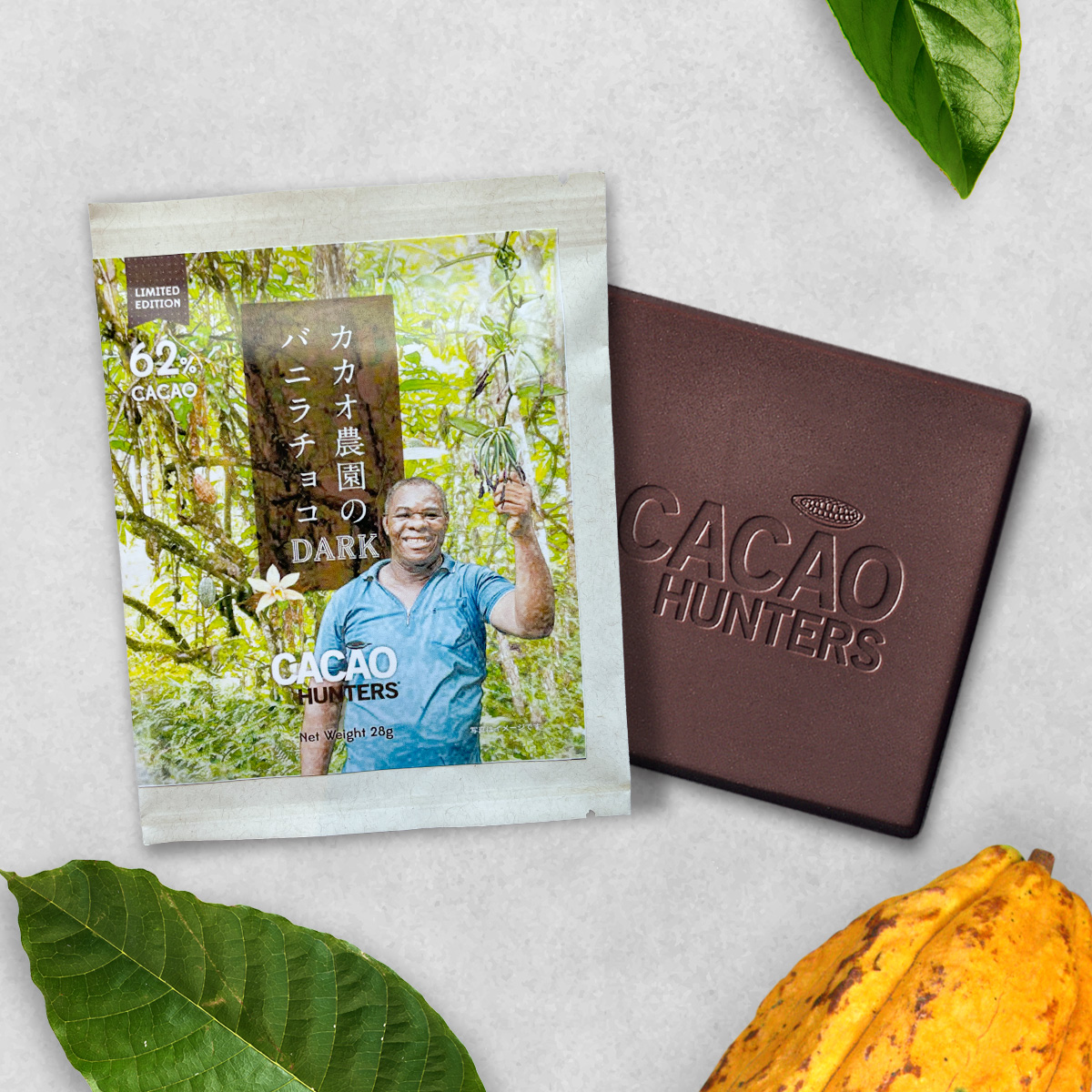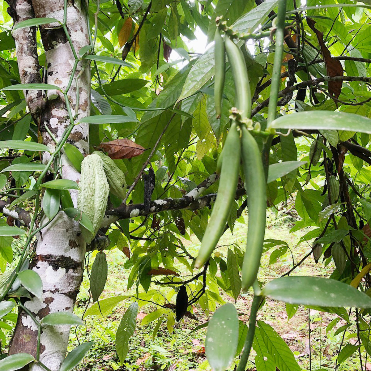 帰国後、かつての農園で幼少期の記憶を辿って発見した自生のバニラ。その後見つけた別品種のバニラを含め、現在は3品種のバニラをカカオの木の根元に1つずつに植え、バニラとカカオの共生に取り組んでいます。収穫期が異なるため、カカオの収入が少ない時期に貴重な収入源となるバニラ。グスターボさんのチームが育てるカカオとバニラのハーモニーを、粒つぶの食感とともにお楽しみください。