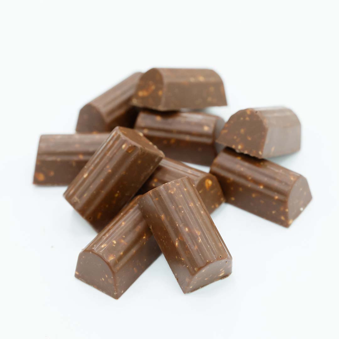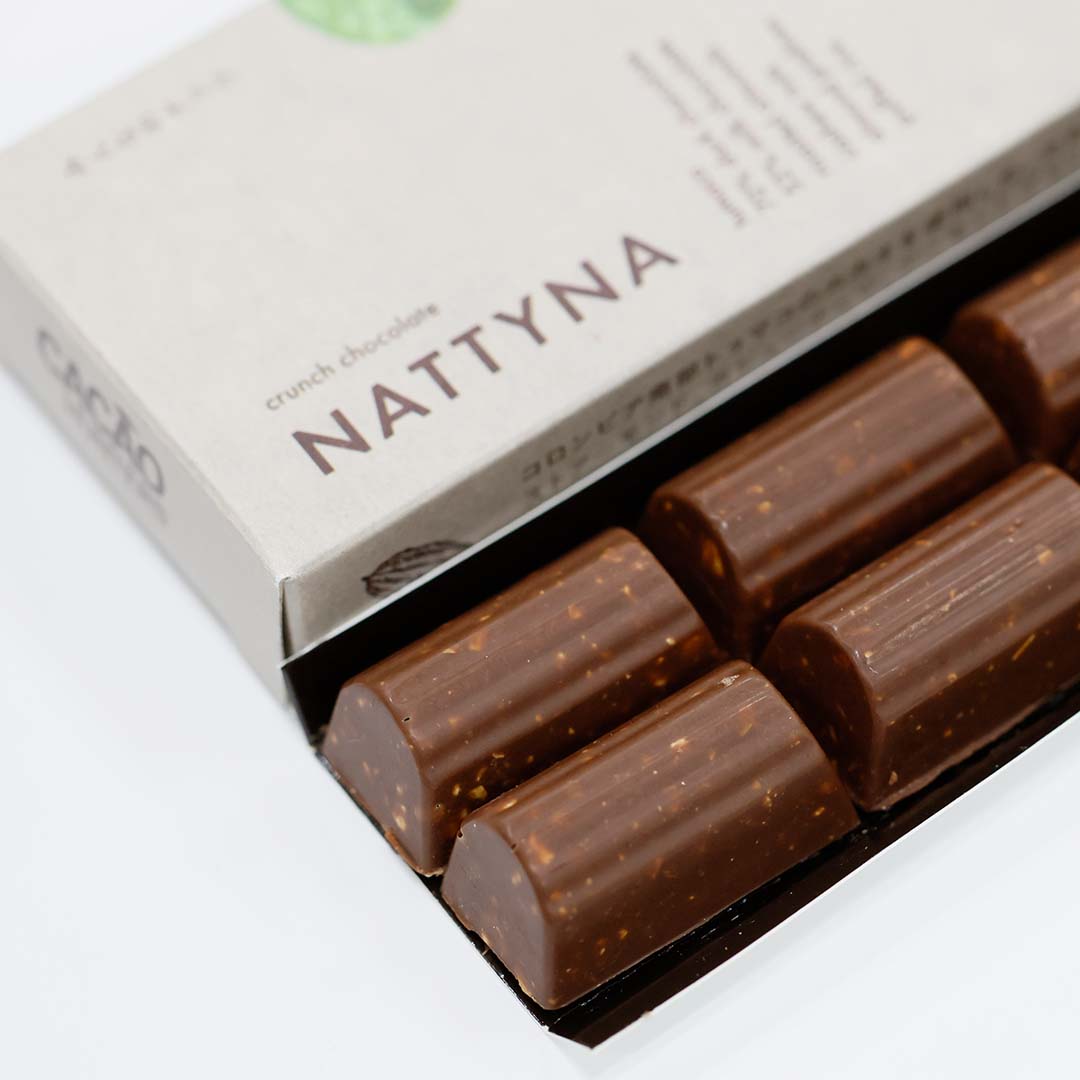 コロンビア南西部トゥマコのカカオを使用した、カカオ分70%のダークチョコレートと53%のミルクチョコレートに、ローストアーモンド、カシューナッツ、マカダミアナッツ、アーモンドプラリネ、ライスパフをミックスしたクランチチョコ。可愛い俵型のチョコからは、サクサク楽しい音と、カカオとナッツのコクが広がります。そのままでももちろん、コーヒーやウイスキーのお供にもおすすめです。